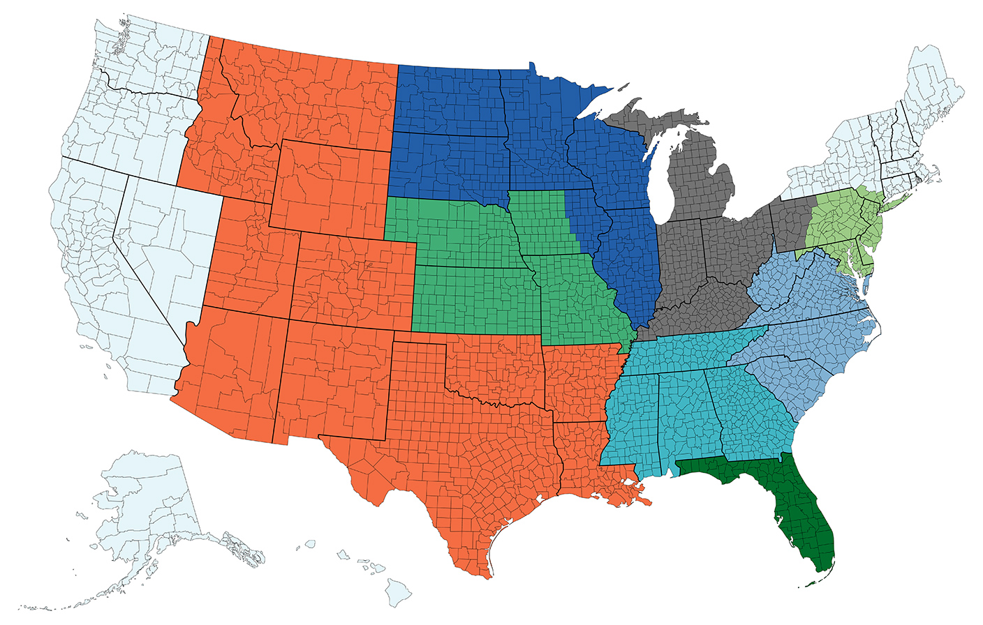 WA, OR, CA, NV, AK, HI, upstate NY, CT, MA, VT, NH, and ME